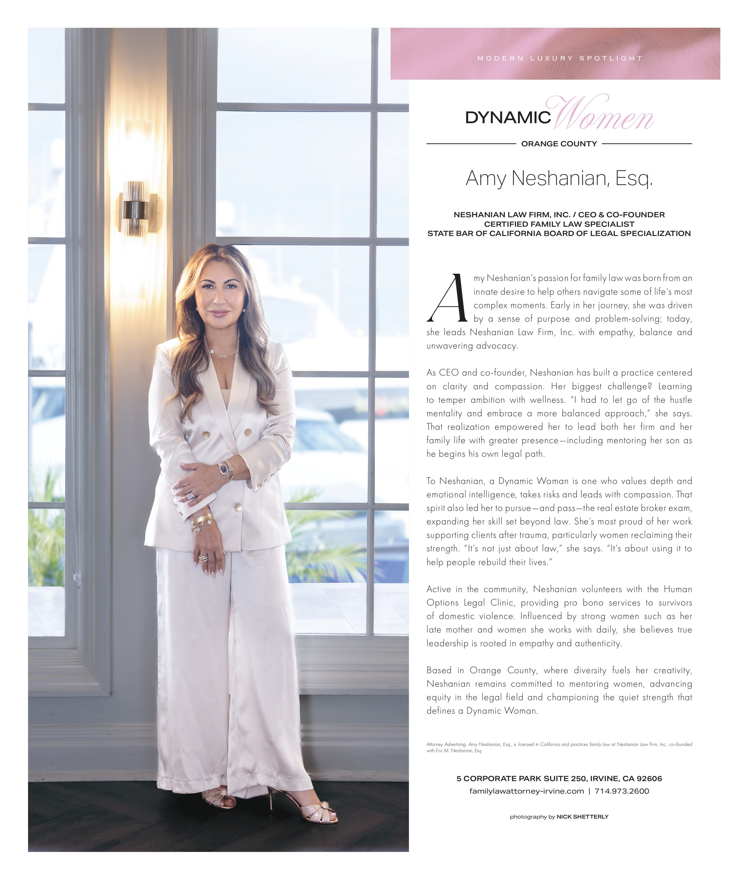 The Magazine honors female leaders, entrepreneurs, and philanthropists who make a meaningful difference in their communities. Amy’s recognition reflects her unwavering dedication to her clients, her ability to lead with integrity, and her vision in shaping The Neshanian Law Firm, Inc. into a trusted legal advocate in Orange County.